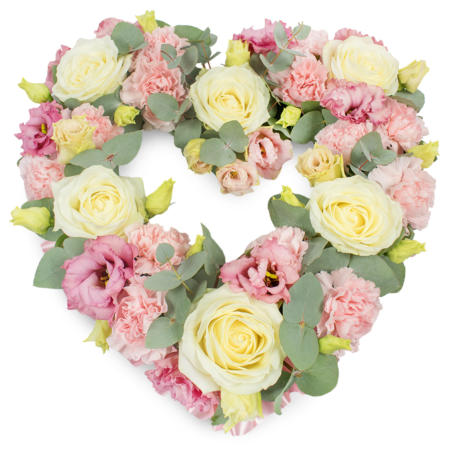 Celebrate and remember with our Graceful Open Heart Tribute. This beautiful bouquet features a delicate mix of white roses, pink carnations, pink lisianthus, and eucalyptus leaves, artfully arranged into an open heart shape to symbolize love and remembrance.